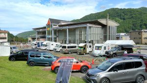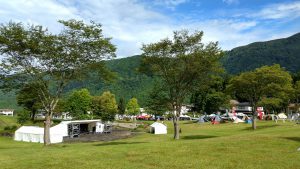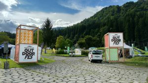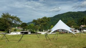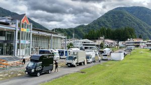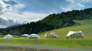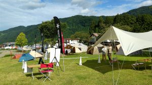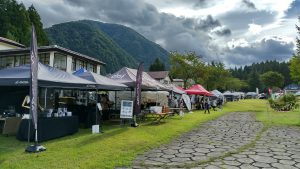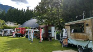一里野公園にはアウトドアメーカーさんなどの出展やキッチンカーの準備が進んでいました。